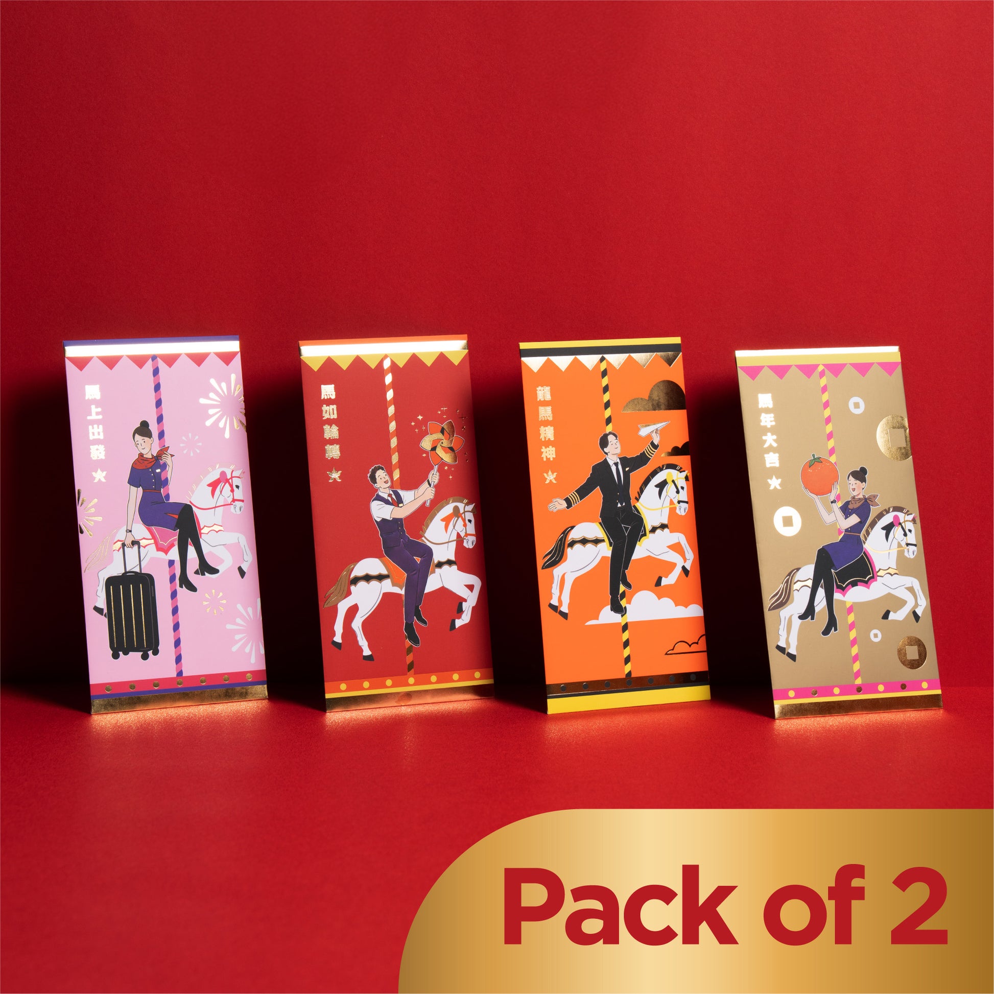 This year, Hong Kong Airlines' red packets are inspired by Hong Kong's unique blend of Eastern and Western cultures. The design features a Western-style carousel and professional flight crew, symbolizing the auspicious meaning of continuous growth and prosperity—like a wheel turning endlessly, bringing good luck without pause. Hong Kong Airlines looks forward to welcoming the hopeful Year of the Horse with you, and wishes you abundant wealth, success, and a swift journey ahead!