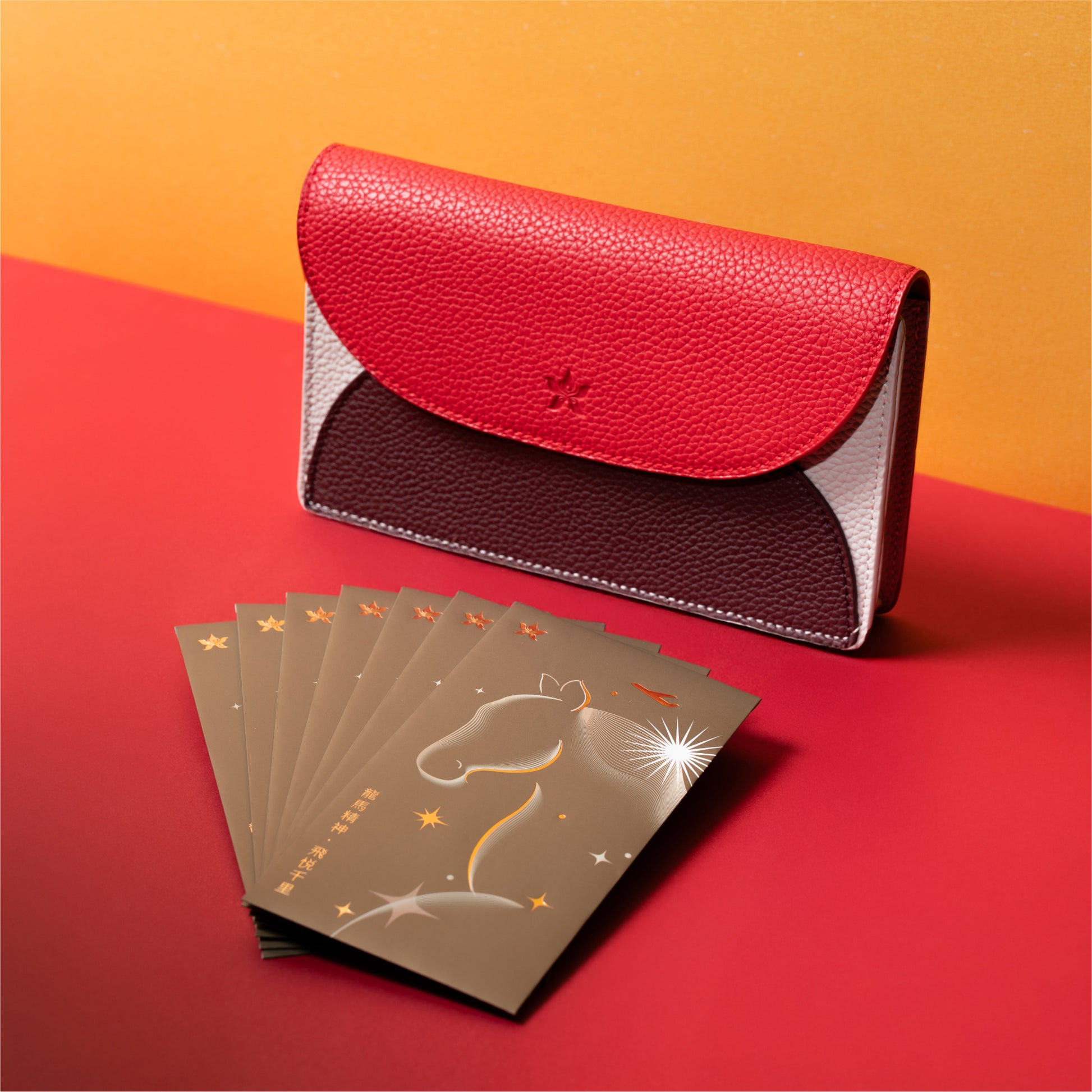 金光閃閃的馬年利是封,配以設計時尚的皮革利是袋。香港航空期待與閣下一同迎接充滿希望的馬年,祈願來年龍馬精神、飛悅千里!